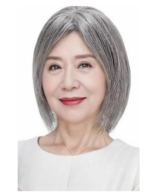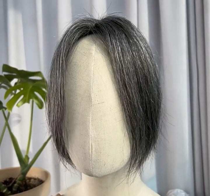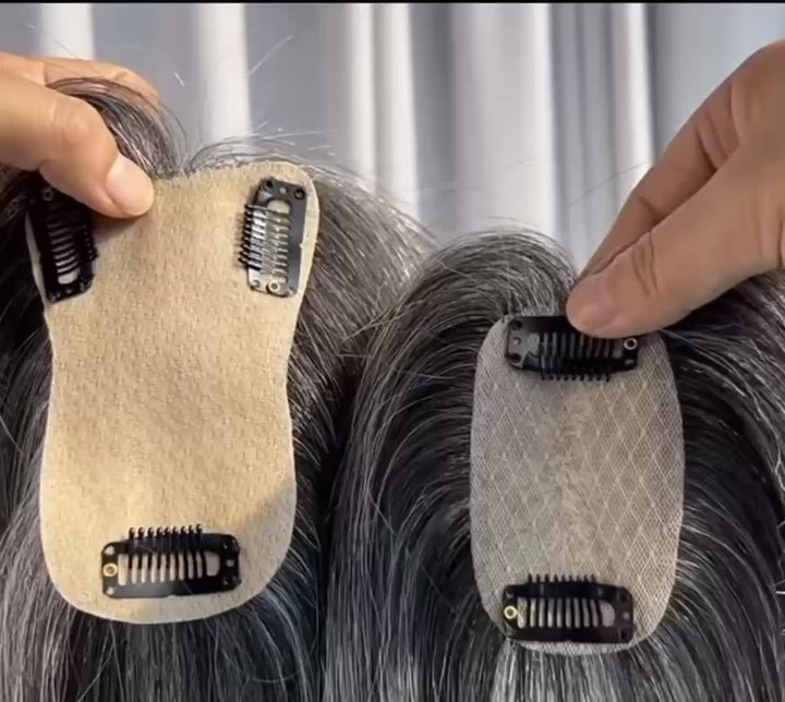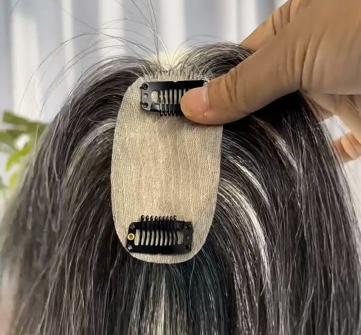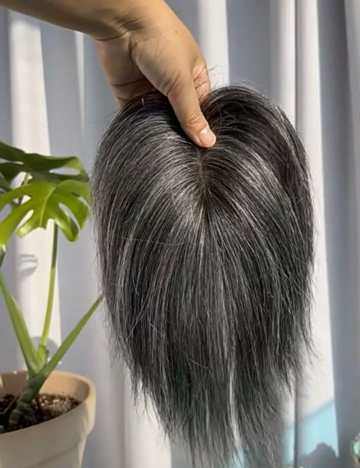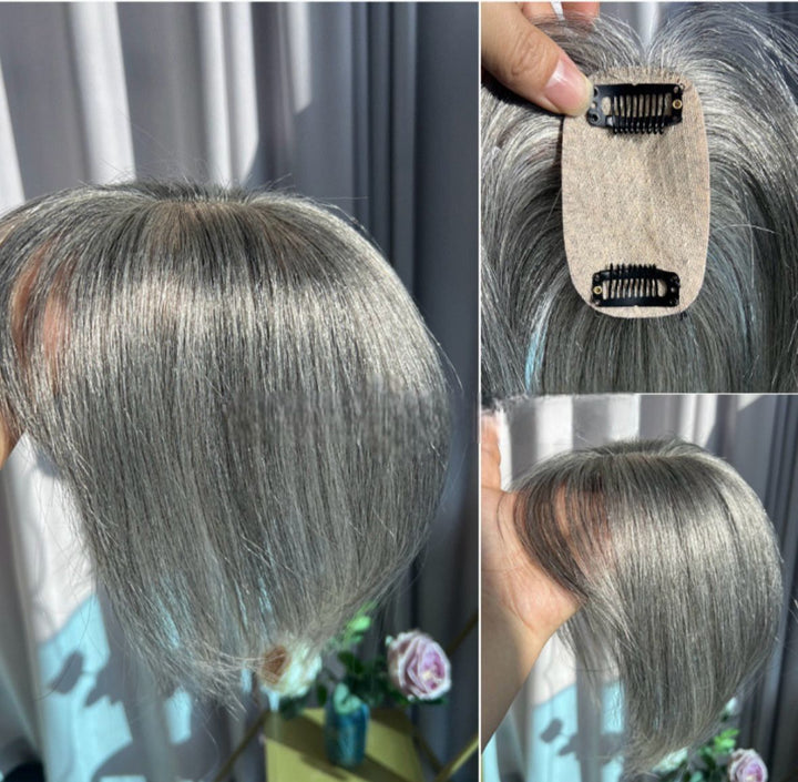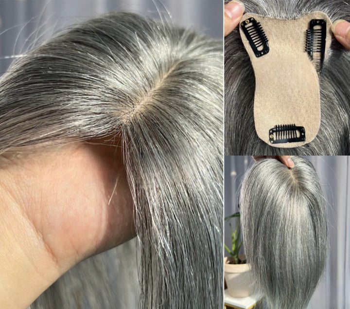 5cmx9cm/8cmx12cm Silk Effect Gray Grey 100%Human hair Topper(50%/70%White Hair Mixed) Clip in 10"